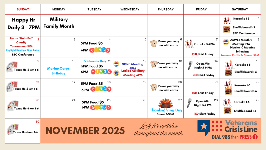 Red Shirt Friday-Wear your RED shirt (Remember Everyone Deployed) to support our deployed troops and receive your second beverage free!